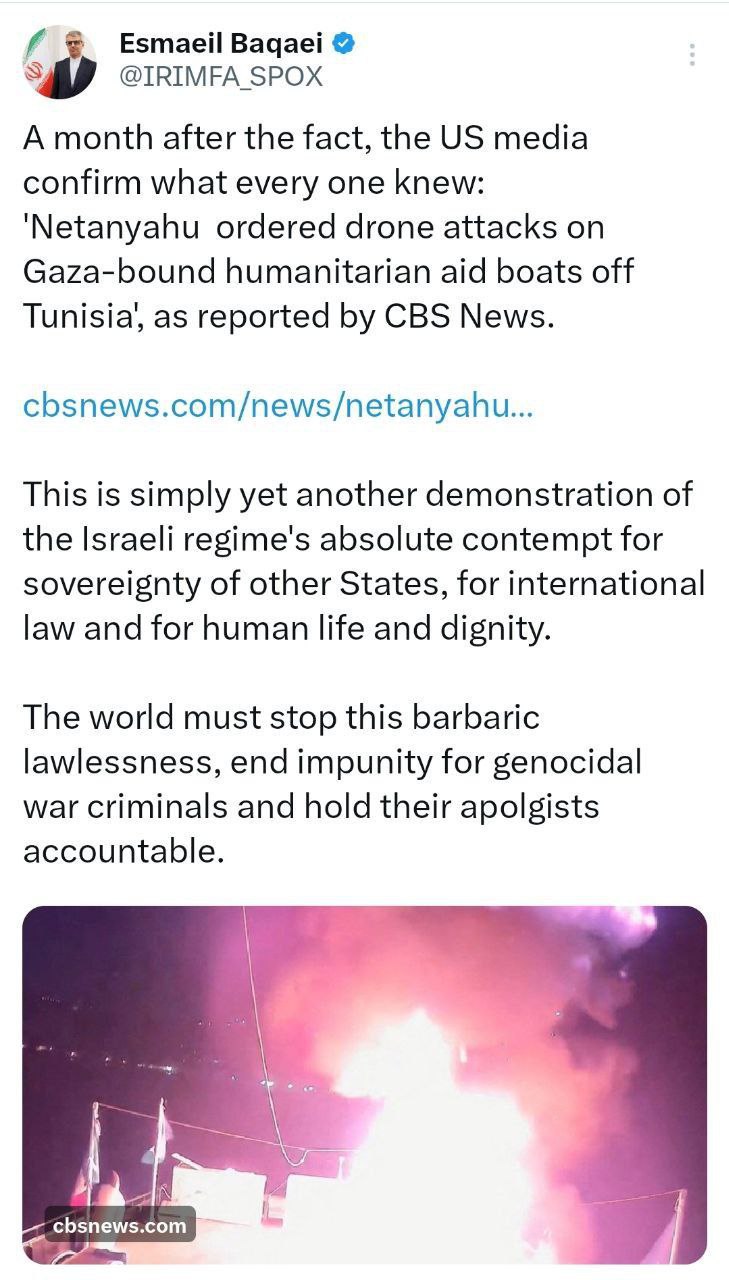 اسماعیل بقائی سخنگوی وزارت امور خارجه تعرض رژیم صهیونیستی به کشتیهای ناوگان بشردوستانه «صمود» در آبهای بینالمللی و بازداشت خشونتبار فعالان حامی مردم فلسطین را بهعنوان اقدامی تروریستی در راستای تداوم قحطی تحمیلی بر غزه دانست و به شدت محکوم کرد.