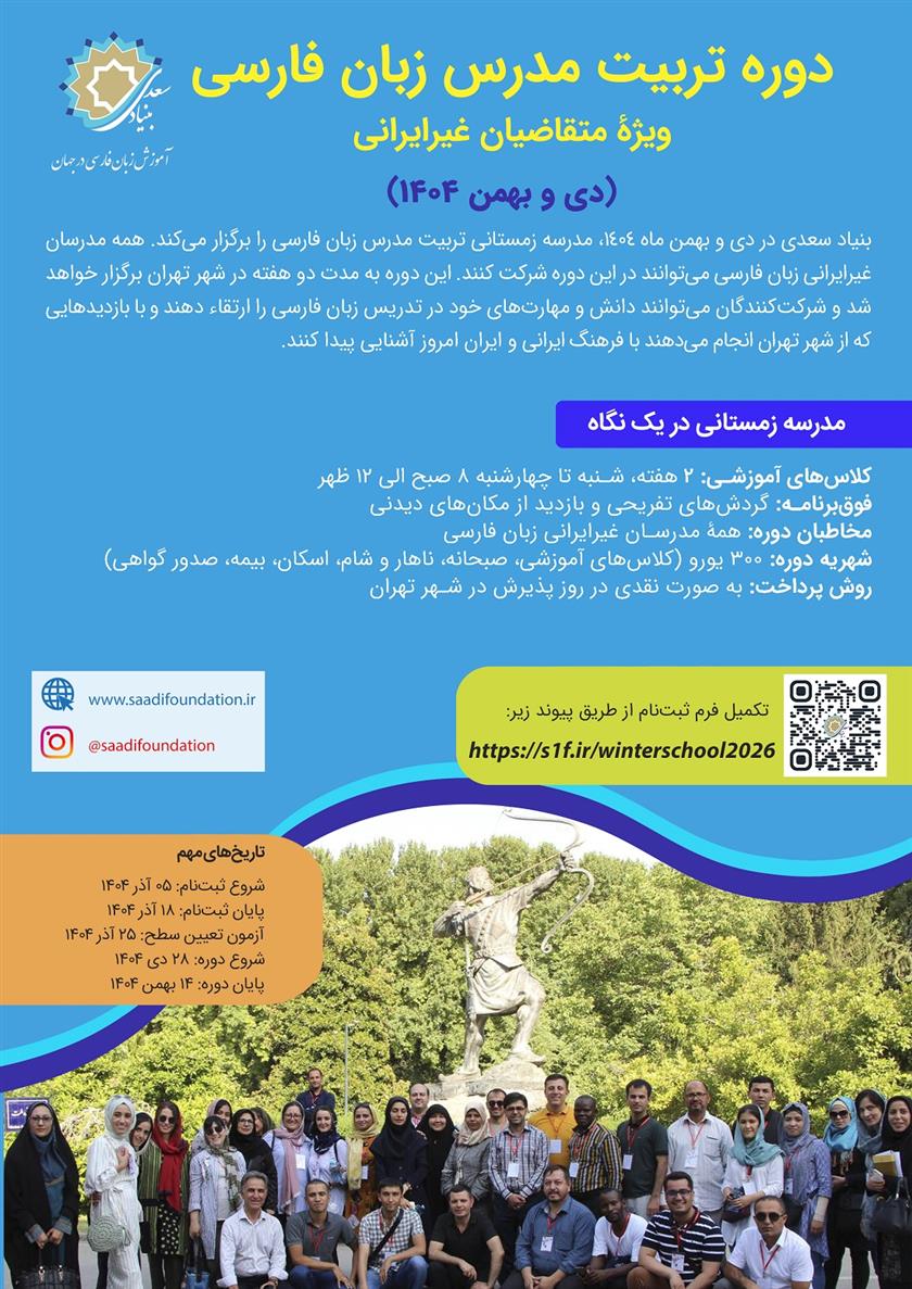 بنیاد سعدی در دی و بهمن ماه 1404، مدرسه زمستانی تربیت مدرس زبان فارسی را برگزار می‌کند. همه مدرسان غیرایرانی زبان فارسی می‌توانند در این دوره شرکت کنند.